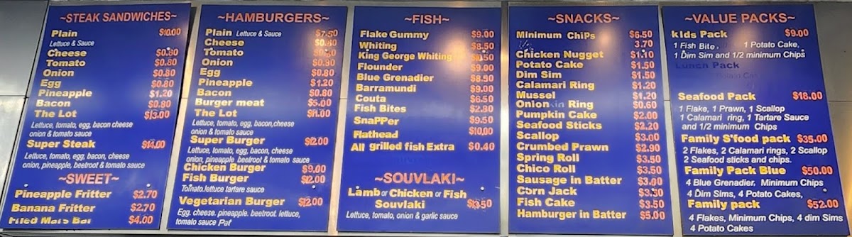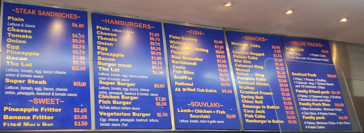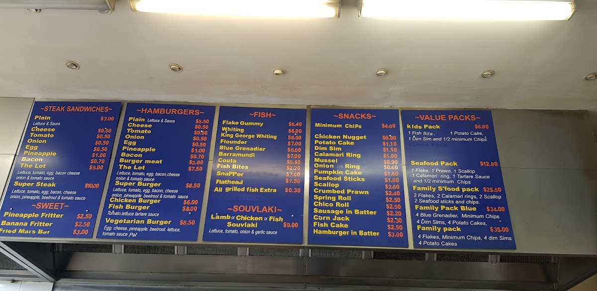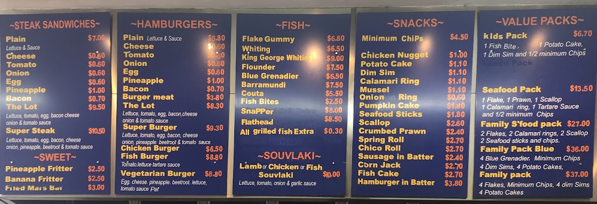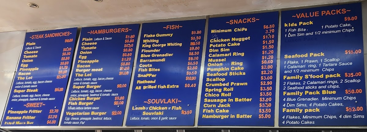 JJ's offers a delightful array of options including succulent fish, crispy chips, and delectable sweet treats like pineapple and banana fritters. For families or those looking for value, there are diverse value packs: from the Kids and Lunch Pack to the hearty Family Seafood and Family Packs.